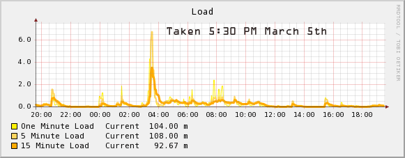 Hmm, nothing in the load graph around the time of the incident. I'm seeing some big delays right now, but its that time of the night that the rkhunter cron job is probably running. Network looks good; Here is a trace: